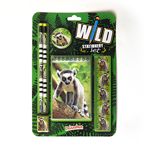A ringtailed lemur stationery set comprising of two pencils, a pencil sharpener, 15cm ruler, an eraser and a 13cm x 8cm notebook.