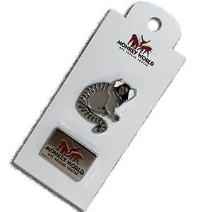 Set of two pin badges. One of a Marmoset the other the Monkey World logo. Sold on a presentation card.